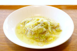 メインのお料理は「白身魚の白菜あんかけ」です。オーブンで蒸し焼きにしますので、お魚はふっくらとやわらか。ほんのりゆず風味の温かい白菜あんと絡み、この時期に心も体も温まるようなお料理です。お好み焼きは長芋をたっぷり入れてふっくらと、またかつお粉を混ぜ込んでうま味たっぷりで焼き上げます。どうぞお楽しみに。