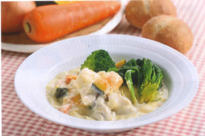 メインのお料理は「かぼちゃのクリームシチュー」です。かぼちゃの優しい甘みが広がる、心も体もほっと温まるようなお料理です。