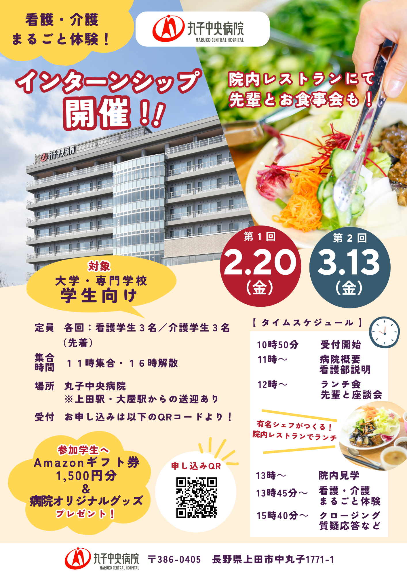 丸子中央病院の概要や看護部の紹介から、先輩とのランチ座談会、院内見学、そして実際の仕事を間近で感じられる「看護/介護まるごと体験」を開催します。少人数制だからこそ、深く学べてしっかり質問もできます。将来の進路を考える第一歩に、ぜひご参加ください!